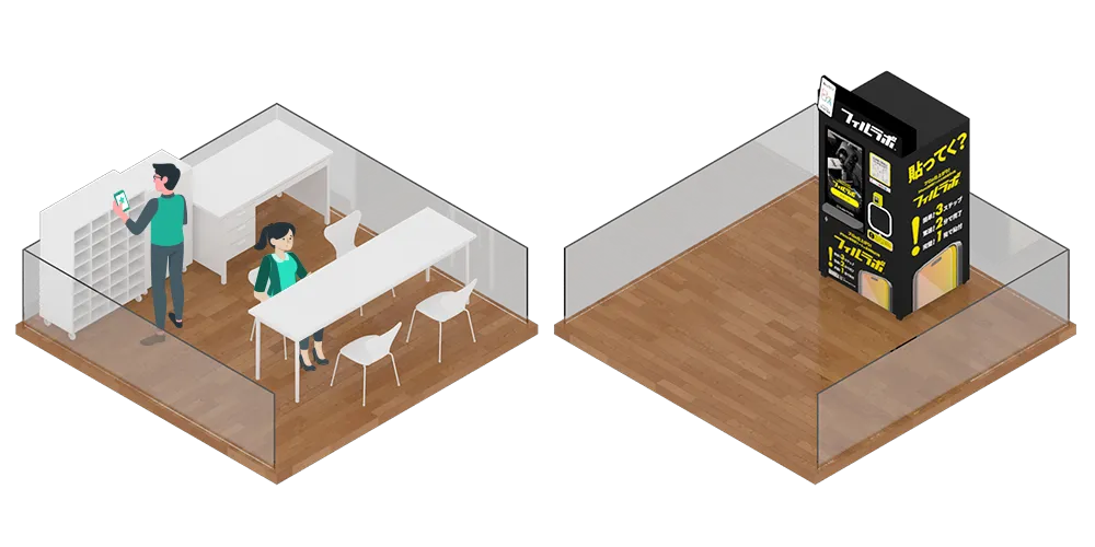 フィルラボは横幅1000mm×奥行き920mm×高さ1750mmの大きさで決済機能(キャッシュレス)、全自動の画面クリーニング機能、保護フィルムの全自動貼付機能、保護ガラスフィルムの在庫スペース、それらを管理するシステムまでを一つの筐体に収めたオールインワン設計です。省スペースでありながら無人運営可能、サービス設計の自由度が大幅に向上し、コスト削減も実現できます。