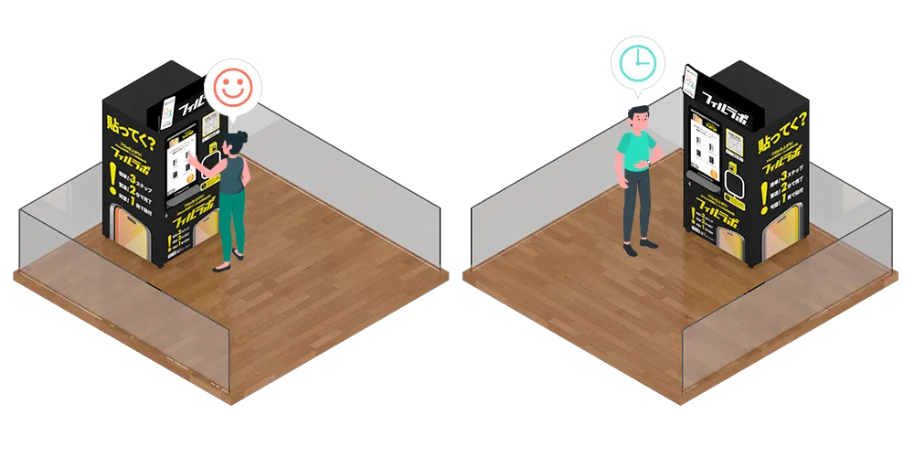 フィルラボは、お客様が筐体の大型タッチディスプレイで自分のスマートフォン機種とガラスフィルムの種類を簡単に選択できるシステムを搭載しています。選択が完了したら、キャッシュレス決済端末で支払いを済ませ、スマートフォンを筐体にセットするだけでOK。約2分で液晶クリーニングとガラスフィルムの正確な貼付が完了します。
