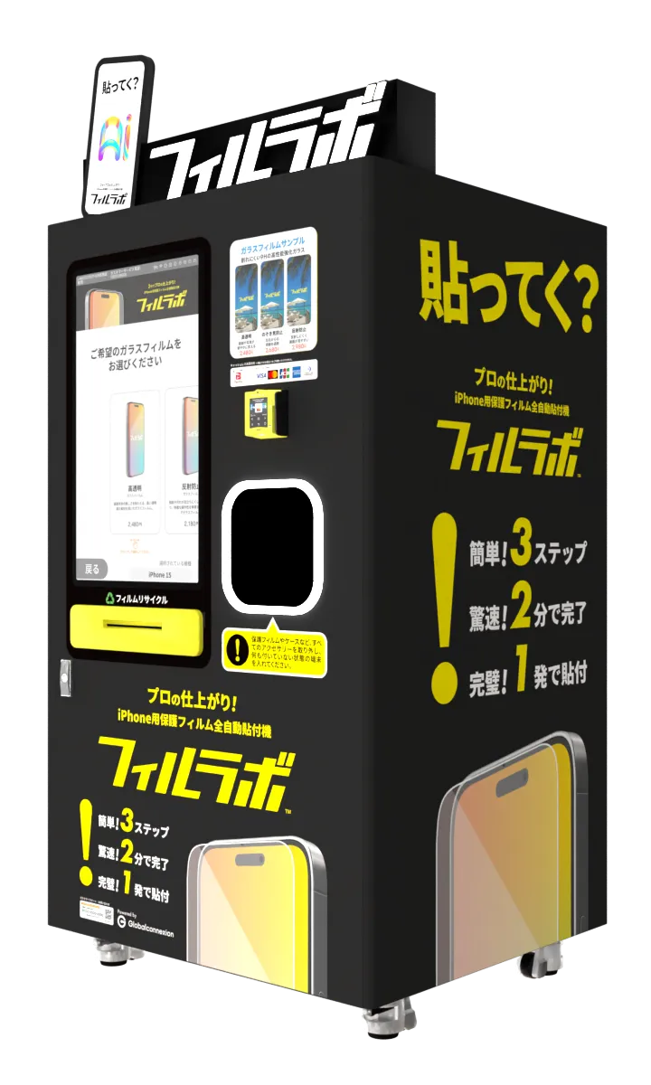 フィルラボは、日本で利用者が最も多いiPhoneシリーズのX以降の機種(SE第1世代、miniを除くすべて)に対応しています。また、設置店舗様にどの機種に対応したどのガラスフィルムを提供するかをフィルラボ筐体ごとに自由に選択していただけるため、ニーズに合わせた柔軟な運用が可能です。さらに今後についても新しいiPhoneはもちろん、iPhone以外のブランドやモデルにも対応予定です。