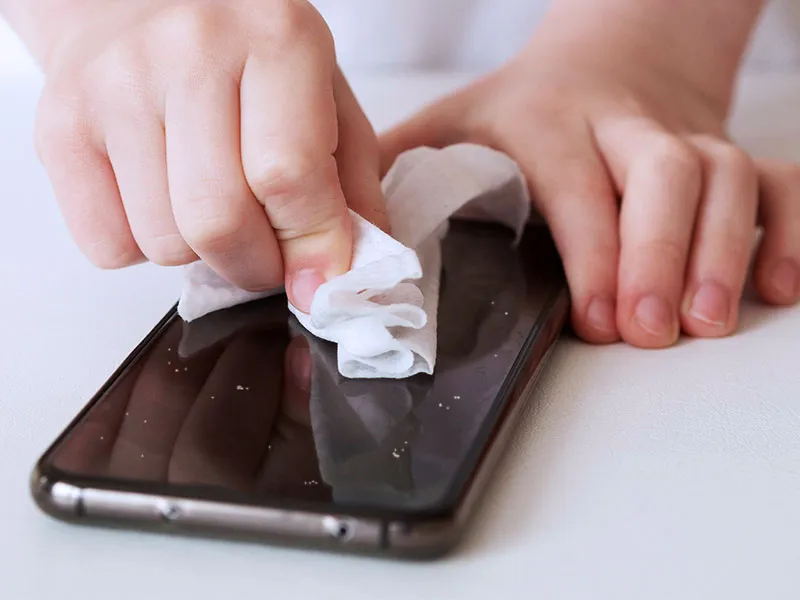 全自動でセットされた端末を専用ブラシ、クロスとクリーニング液でしっかりクリーニング。